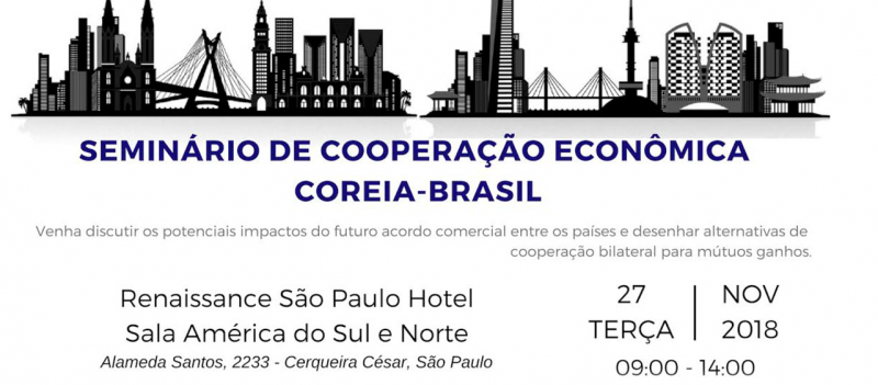 No dia 27 de novembro de 2018, a KOTRA (Korea Trade-Investment Agency) realiza o Seminário de Cooperação Econômica Coreia-Brasil, às 9h, no Renaissance São Paulo Hotel.